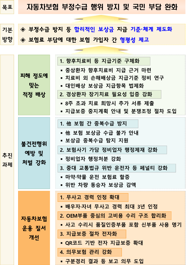 국토교통부와 금융위원회는 "자동차보험 운영 질서를 합리적으로 개선하여, 보험 가입자의 부담을 줄이고, 피해자가 적정한 보상을 받을 수 있도록 하겠다"고 밝혔습니다. 보험업계, 의료계, 소비자 단체와 협력하여 투명하고 건전한 자동차보험 체계를 구축하는 데 최선을 다할 계획입니다.