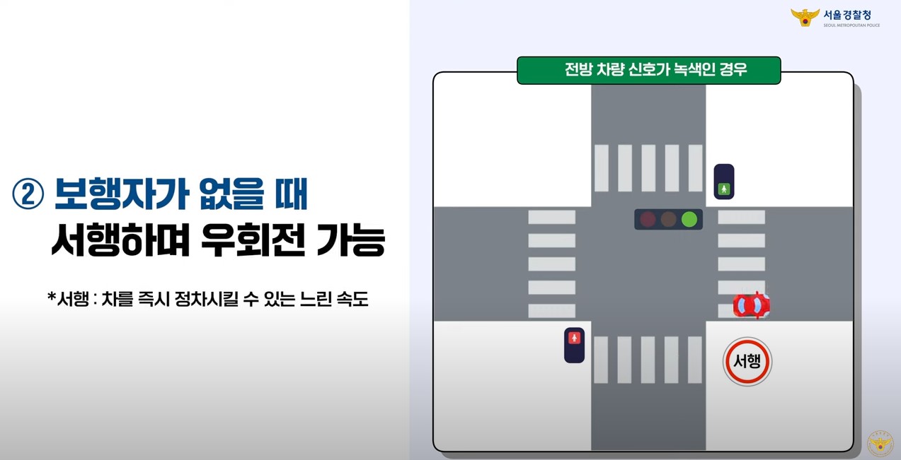보행자가 없다면 서행하며 우회전을 해야 합니다.