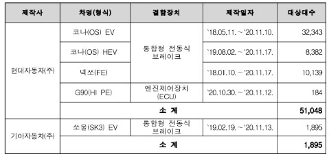 국토교통부(김현미 장관)은 현대자동차, 기아자동차, 도요타, 포드, 에프씨에이(FCA), 비엠더블유(BMW) 에서 제작 또는 수입판매한 총 47개 차종 82657대에서 제작결함이 발견되어 시정조치(리콜)한다고 밝혔습니다.