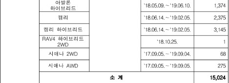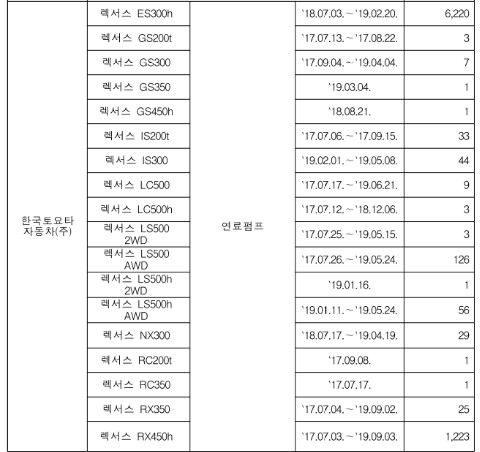 - 렉서스 ES300h, GS200t, GS300, GS350, GS450h, IS200t, IS300, LC500, LC500h, LS500 2WD, LS500 AWD, NX300, RC200t, RC350, RX350, RX450h, 아발론 하이브리드, 캠리, 캠리하이브리드, RAV4 하이브리드 2WD, 시에나 2WD, 시에나 AWD