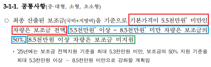 환경부는 2024년식 보조금(국고 보조금+지자체 보조금) 지원 기준 및 단가를 발표했는데요. 100% 받을 수 있는 기준 가격은 5,500만 원 미만이어야 합니다.