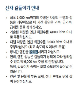 주변에선 2000km까지 타고 하라지만, 저는 얼른 하고 싶었어요. 제네시스 GV70 설명서에도 1000km정도까지는 급가속 급제동을 자제하고, 4천 rpm을 넘지 않는 선안에서 타라고 하더라고요. 장시간 공회전도 삼가해주세요!