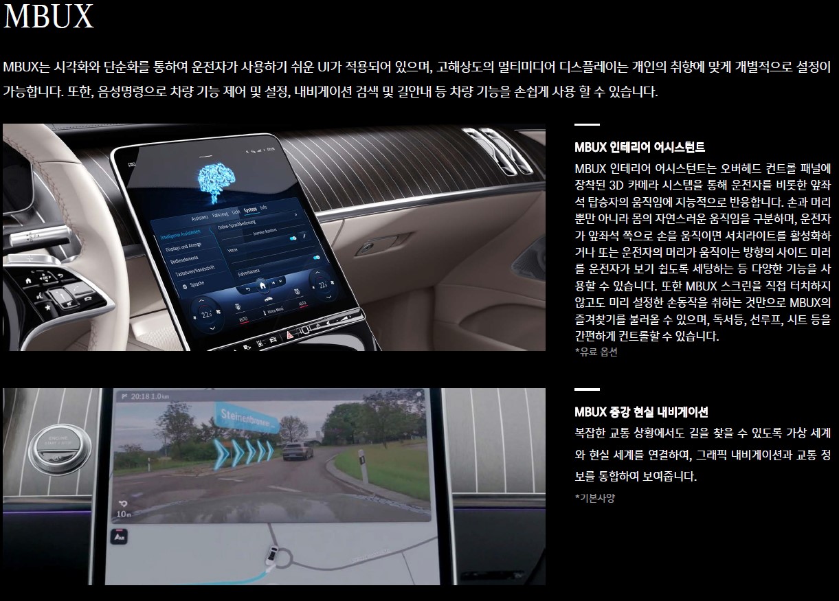 2018 CES 에서 발표된 기능입니다. 2018년 이후에 제작된 차량들도 이것들을 탑재한 채 출시가 되었죠. 2021 S클래스도 MBUX를 탑재하여 출시 됩니다. 터치스크린은 기본, 증강현실네비게이션, 명령어도동작하는 지능형 음성제어 능력도 갖추고 있습니다. 당연히 뒷자석에서도 조작할 수 가 있고요. 아이언맨 영화를 본사람들은, 나만의 인공지능비서 '자비스'를 기억하실거에요. 토니스타크가 굳이 말을 하지 않아도, 손동작하나만 보여도 자비스가 알아서 조작을 해주는 최첨단의 기술이 MBUX에서도 가능하다고 합니다. 손을 움직여 서치라이트를 활성화한다거나 운전자의 머리가 움직이는 방향의 사이드 미러를 보기 쉽게 세팅한다던지! 이건 참 궁금하네요.