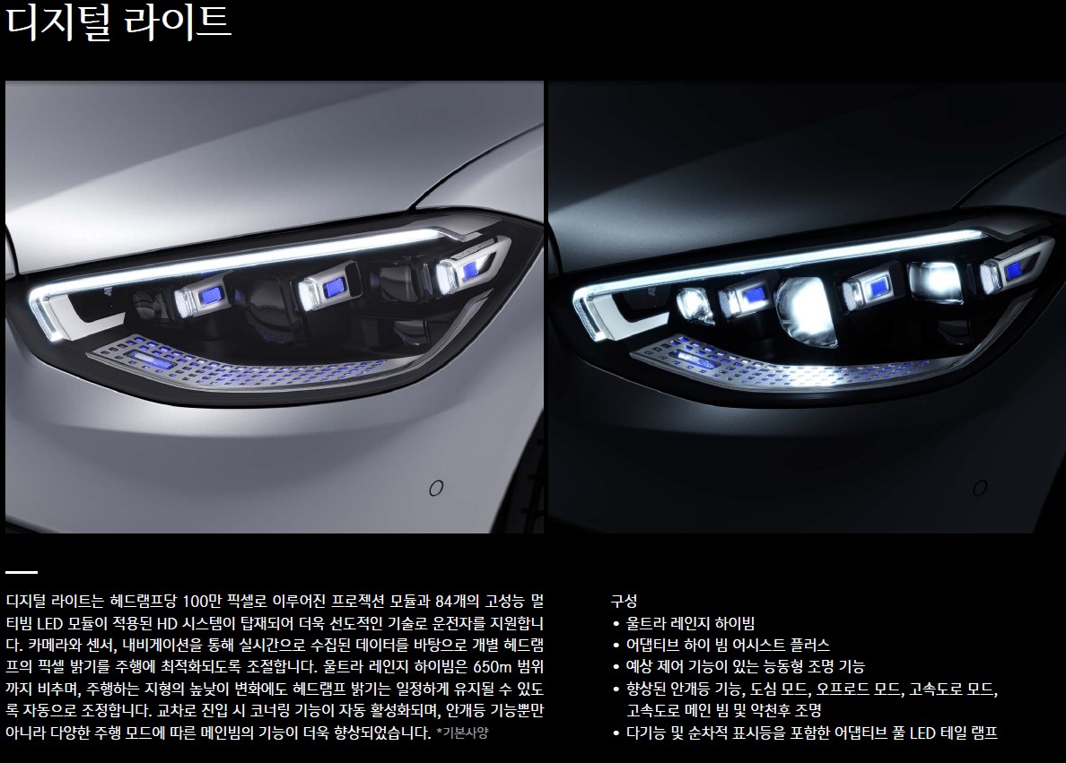 헤드램프당 100만 픽셀로 이루어진 프로젝션 모듈과 84개의 고성능 멀티빔 LED 모듈이 적용되어 운전자를 지원합니다. 카메라의 센서와 내비게이션을 통해 실시간으로 수집된 데이터들을 통해 주행에 최적화된 밝기를 비춰주죠. 악천후나 안개속에서 주행할 때 빛을 발합니다.