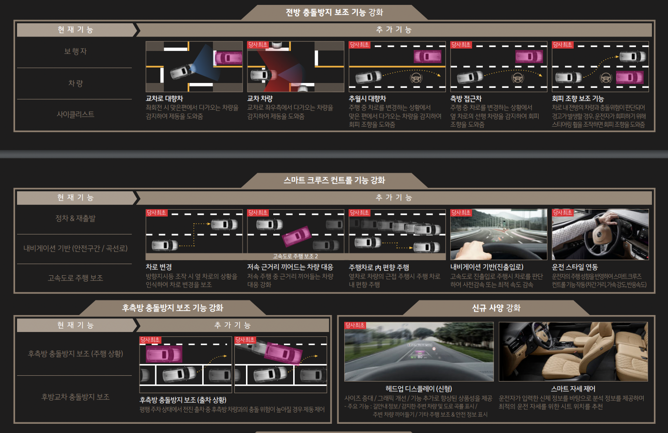 전방 충돌방지 보조기능 강화, 스마트 크루지 컨트롤 기능 강화, 후측방 충돌방지 보조기능 강화, 신규 사양 강화 편에서 확인 하실 수 있습니다.