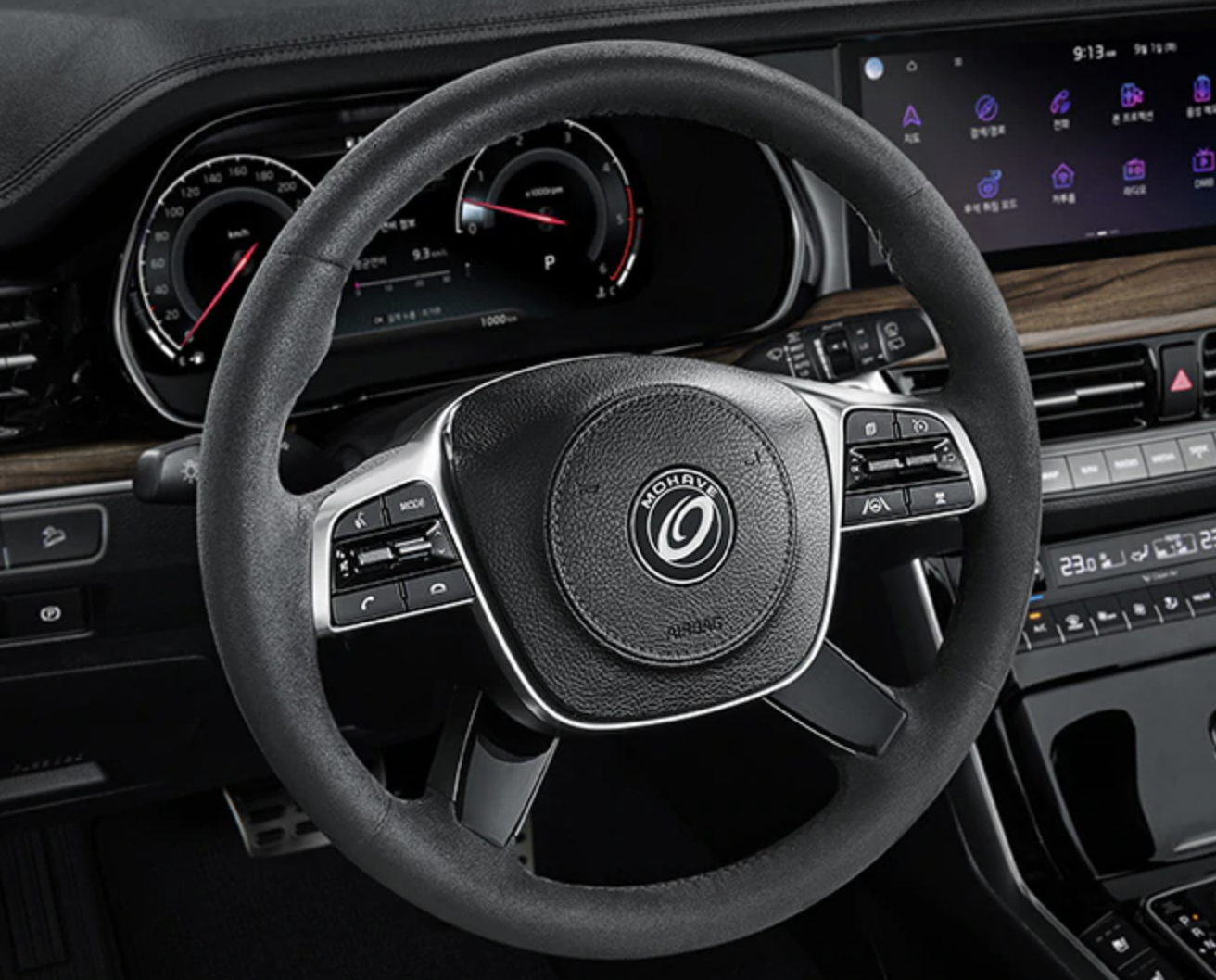 그래비티 트림의 사양엔 알칸타라 스티어링 휠, 알칸타라 센터콘솔 암레스트, 알칸타라 도어 암레스트 & 센터트림, 1열 도어 앰비언트 라이트가 포함되어있습니다. 알칸타라도 모하비의 등급에서는 처음으로 만나보는게 아닌가 쉽군요. 스팅어 마이스터에도 알칸타라 스티어링 휠입니다.