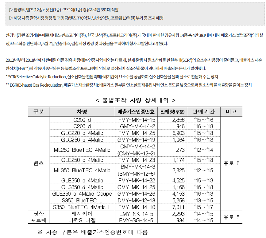 5월 6일 보도된 자료에 의하면 메르세데스-벤츠 코리아가 2012년부터 2018년까지 판매한 여러 차종들에 대하여 배출가스 저감장치를 불법 조작한 사실이 적발되었다고 뉴스가 떴습니다.