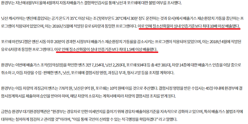 그리고 닛산과 포르쉐는 각각 10배, 1.5배의 질소산화물이 인증기준보다 배출되었다고 나왔습니다.