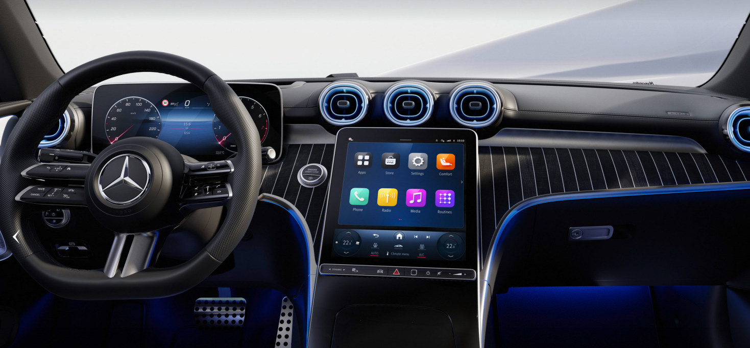 실내 디자인은 C클래스와 상당히 유사합니다. 대시보드는 세 개의 큰 에어벤트와 중앙에 큰 세로형 터치스크린이 특징입니다. S클래스를 그대로 떼어다 박은 셈입니다.