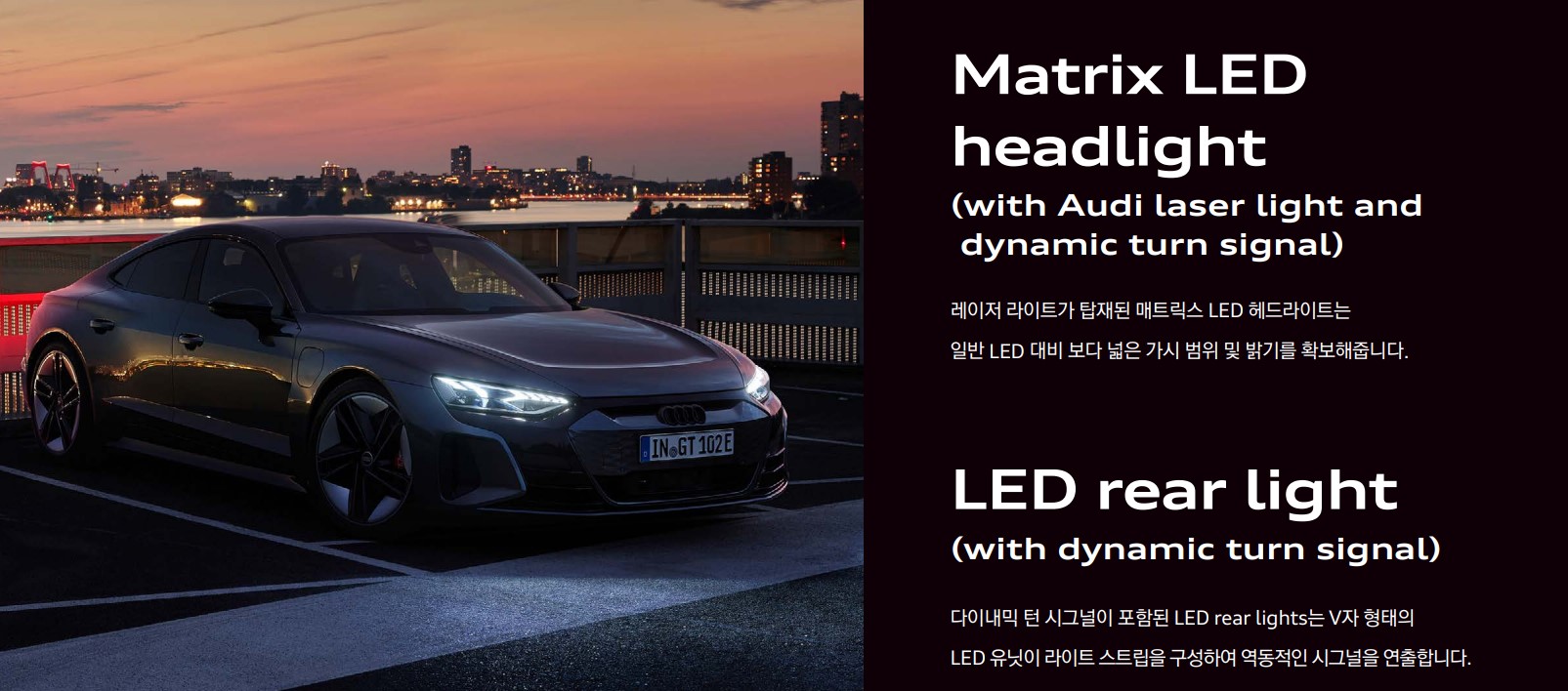 아우디의 준대형 4도어 쿠페형 스포츠 세단이며 전기자동차입니다. 보자마자 포르쉐의 타이칸(전기차)을 겨냥하고 나온것으로 생각했는데, 역시나 플랫폼도 포르쉐의 타이칸과 동일하고 모터, 배터리 등 핵심부품들도 공유합니다.
