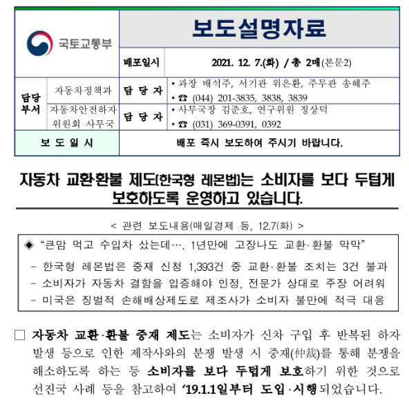 21년도 1월에 레몬법 1호가 메르세데스-벤츠 사에 시행되었습니다.