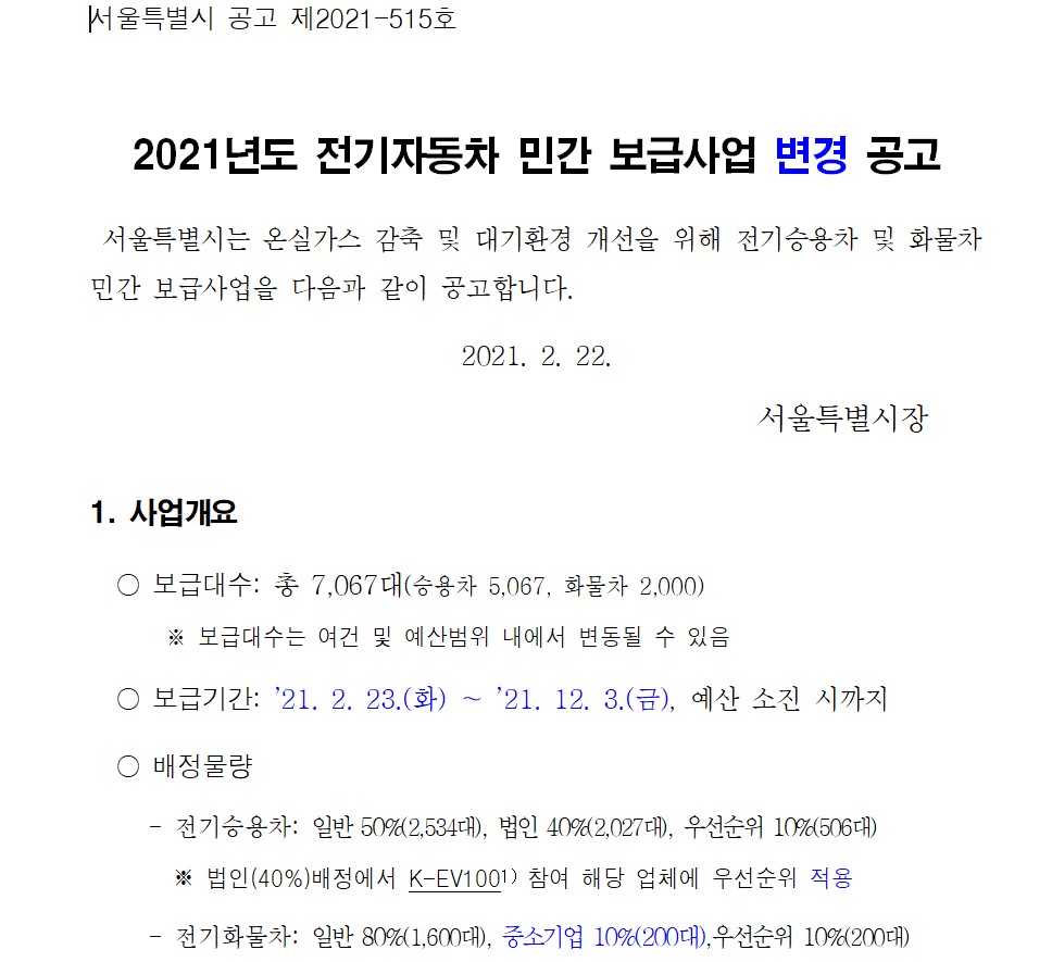 전기차 보조금은 선착순대로 지급이 되기로 하였는데요. 그보다 사회취약층과 전기택시, 노후차량 대체 우선순위로 나눠주게 되어있습니다. 그럼 일반인들이 받게 될 보조금은 정말 몇 대 안남은거더라고요. 그리고 의무사항으로는 2년간 차를 유지해야되고 등등의 많은 정보가 있습니다. 꼭 확인하시고 신청하세요.