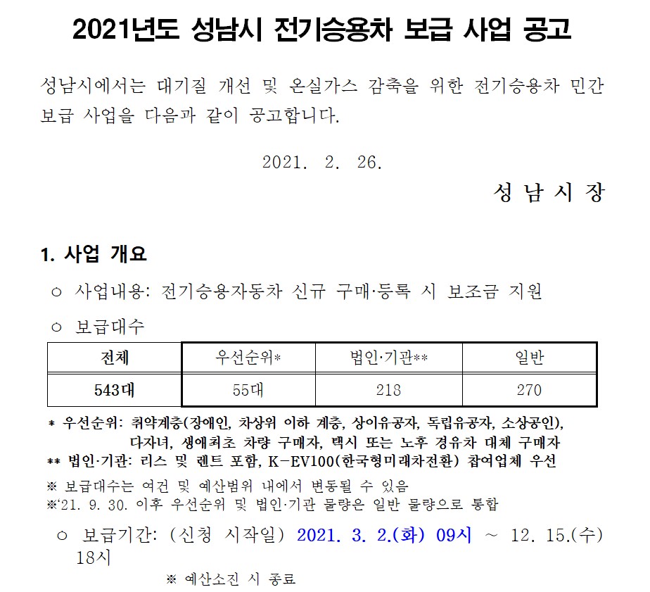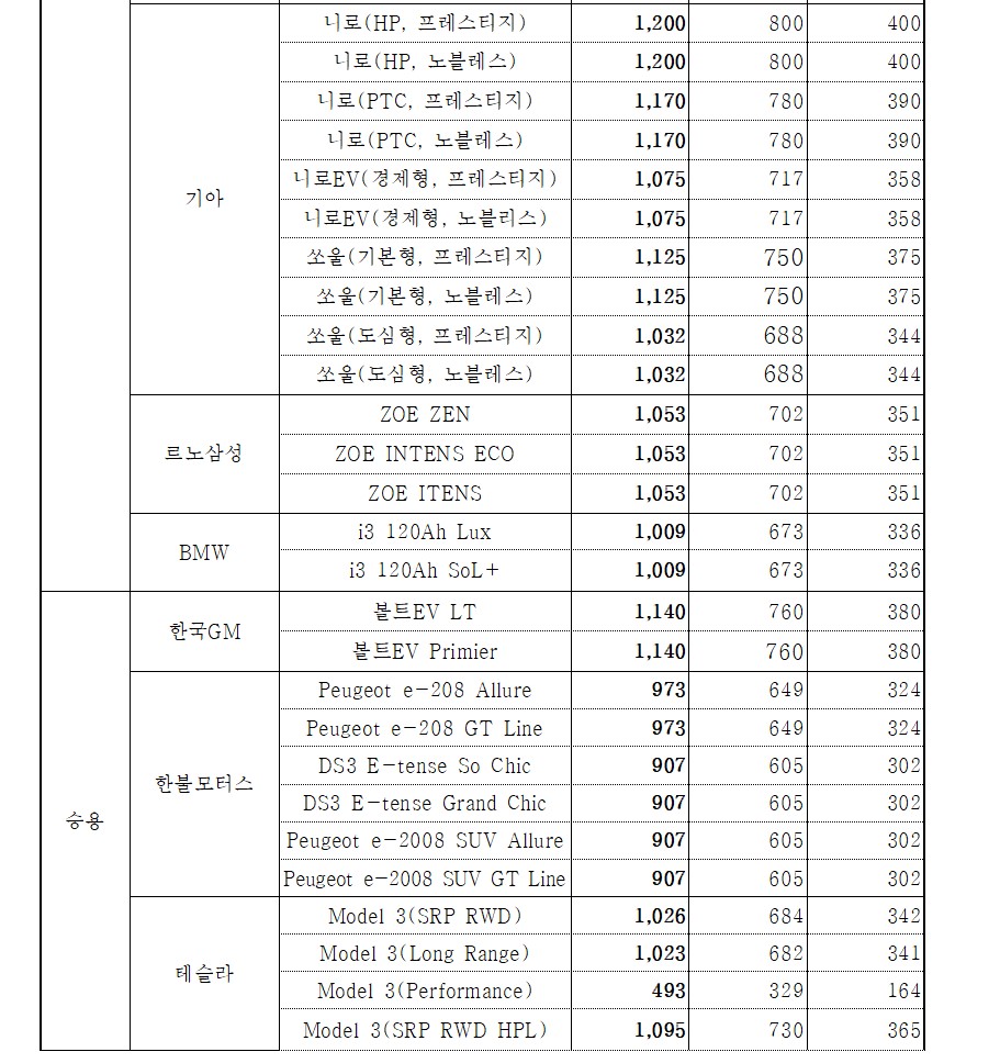 성남시의 각 차종 보조금입니다.