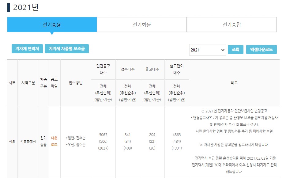 밑으로 쭉쭉 스크롤을 내리시면 제주도까지 나와 있는거 확인되시죠? 여기서 내가 사는동네를 클릭하셔서 확인하시면 됩니다. 밑의 사진은 2021년도 기준으로 나온 상황입니다. 서울은 전기 승용 기준 5067대에서 4863대 남았네요. 사진 상단에 '전기승용, 전기화물, 전기승합'이라고 나뉜 탭으로 구분하시면 됩니다.