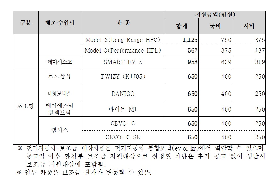 성남시도 서울시처럼 최대 1200만원까지 가능하네요. 테슬라도 1125만원이고요!