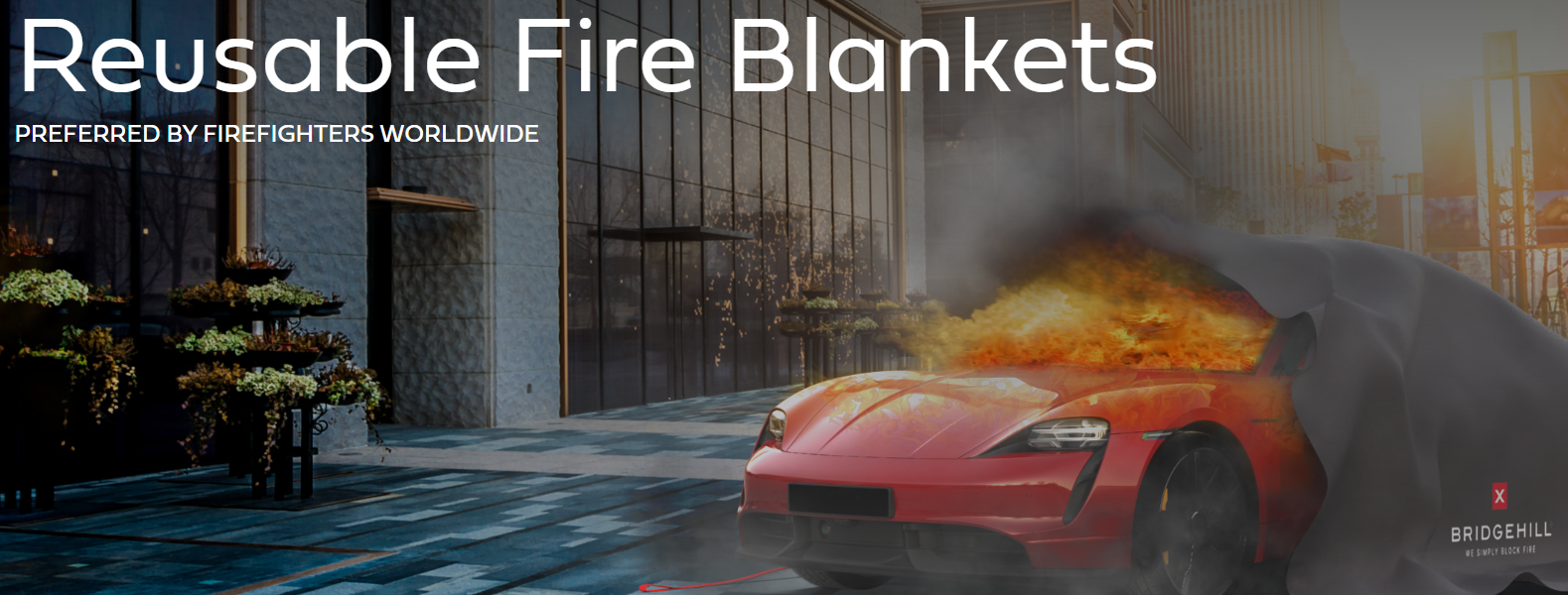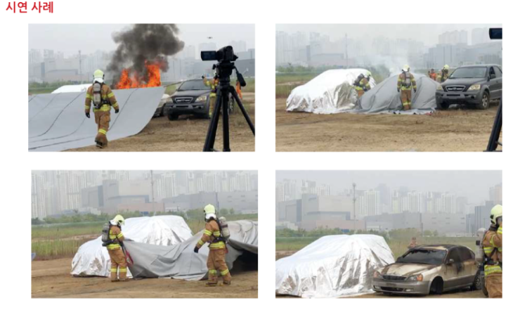 노르웨이의 브릿지힐(Bridgehill)이라는 회사에서 개발한 화재진압담요(Fire Blanket) 즉, 소화포로 불리는 제품입니다. 물은 필요 없이 오로지 담요로 차를 덮어 진화시키는 방법입니다. 물이나 소화약제를 사용하지 않고 화재를 진압할 수 있게 특별히 고안된 제품으로 매연 및 고온, 초미세먼지의 피해를 줄일 수 있는 획기적인 아이템입니다.