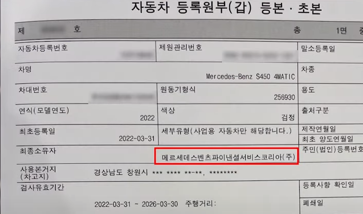 차명에 S450 4 MATIC이라는 글씨가 보이죠? 자동차 웬만큼 좋아하시는 분들은 자동차등록원부가 없었더라도 바로 알아챘을 겁니다. 저처럼요.