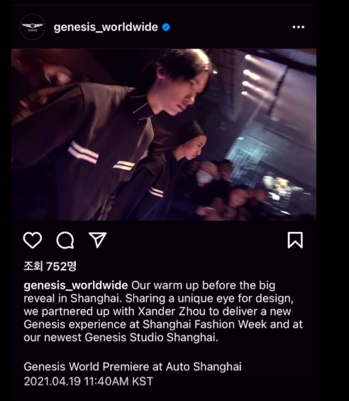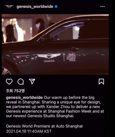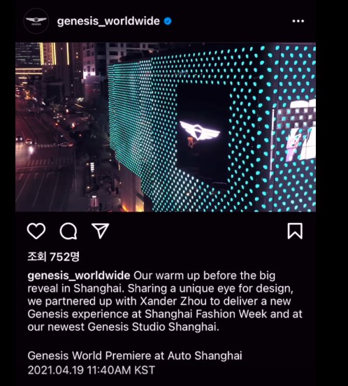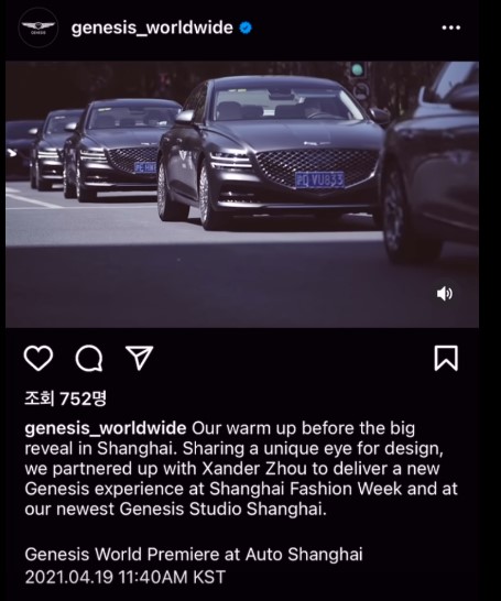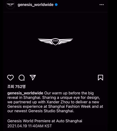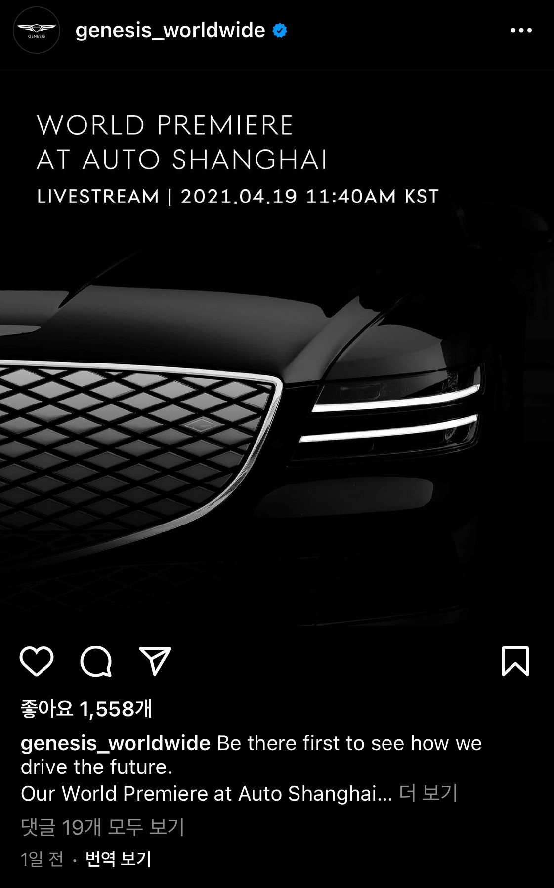 어제(4월 14일)였습니다. 제네시스 월드와이드(genesis_worldwide) 인스타 계정에서 2021년 4월 19일 한국시간 11:40 에 상하이 모터쇼에 제네시스를 첫 선보인다고 공고가 떴습니다.