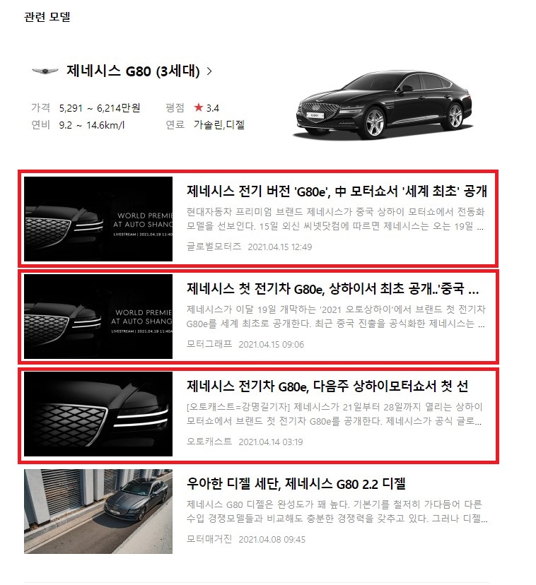 근데 하루가 지난 오늘(4월 15일) 각 종 자동차언론매체에서 상하이모터쇼에서 제네시스 G80e 를 발표할 예정이라는 기사들이 뜨더라고요.