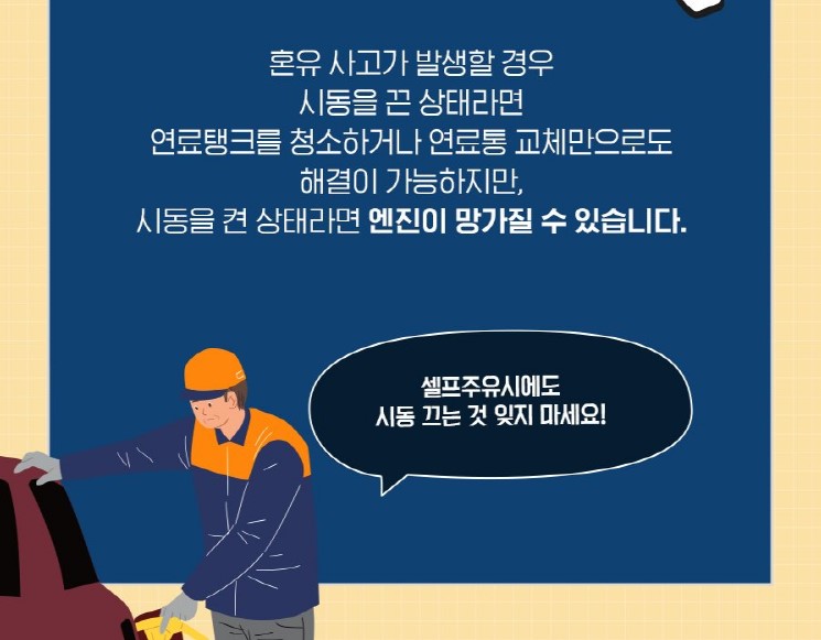 혼유 사고가 발생할 경우 시동을 끈 상태라면 연료탱크를 청소하거나 연료통 교체만으로도 해결이 가능하지만, 시동을 켠 상태라면 엔진이 망가질 수 있습니다. 시동을 켠 상태에서는 엔진안의 실린더까지 연료가 공급이 되는 상태이기 때문에, 엔진안까지 청소를 100%깔끔하게 한다면 사용이 가능하겠죠! 근데 그게 가능할까요? 가능하더라도 연결되어있는 호스들 조차도 교체해야 될겁니다. 몇년 전만해도 승용디젤이 나오면서 혼유사고가 빈번하게 일어났는데요! 이것 또한 위험요소가 될수 있겠네요! 하지만, 휘발유와 경유차의 주유구입구 크기가 달라서 혼유사고가 일어날 확률은 그렇게 많지가 않다고 하네요! 저도 경유차가 휘발유차보다 연료주입구가 큰걸로 알고있어요.