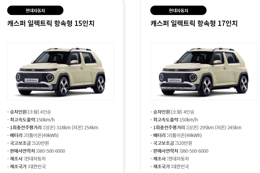 현재 캐스퍼는 15인치와 17인치 타이어를 기준으로 520만 원 국고보조금을 받을 수 있습니다. 세제후 혜택으로 깡통옵션(무옵션)으로 2,990만 원으로 출고가 됩니다.