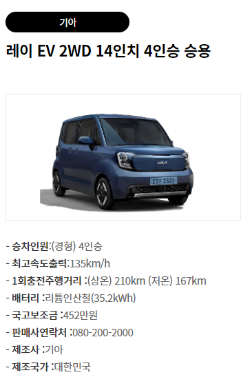 레이는 소형차가 아닌 경차에 속합니다. 그리고 리튬이온 배터리가 아닌 리튬인산철 배터리를 탑재하죠. 정부는 리튬인산철 보다 리튬이온 배터리에 더 많은 보조금을 준다고 제시했었습니다.