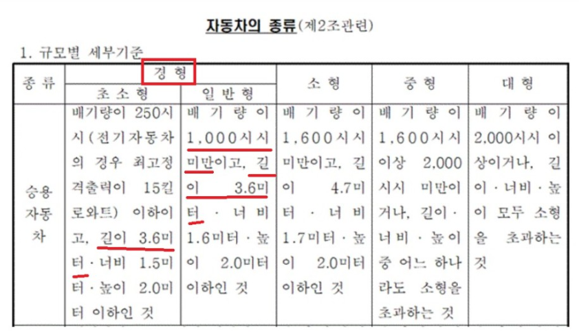 실제로도 자동차의 사이즈는 밑의 표 처럼 나뉘게 되는데요. 정확한 치수는 나오지 않았지만 전장이 3,800mm가 넘어 경형이 아닌 소형 SUV로 될 가능성이 있습니다. 그럼 경차의 혜택은 못 받게 되는 거죠.