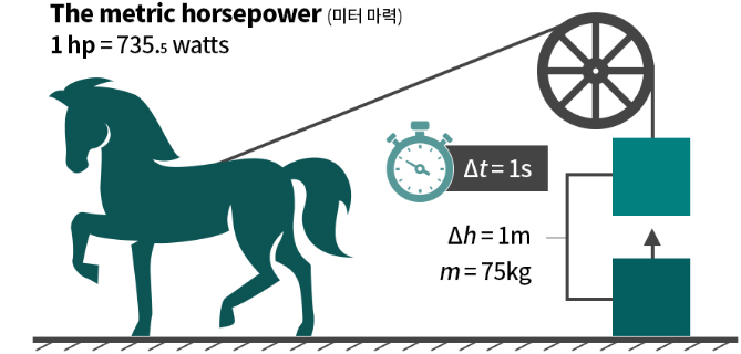 마력은 '말(horse)이 내는 힘'이라고 다들 많이 알고 계실 텐데요! 맞긴 하지만, 좀 더 정확히 표현하자면 '한 마리의 말이 1초 동안 75kg의 물체를 1m 들어 올리는 힘'이에요!