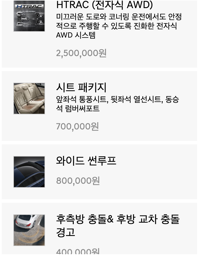 보통 이런 식으로 옵션이 들어가게 되면 차값의 50%를 더 낸다고 하더라고요.