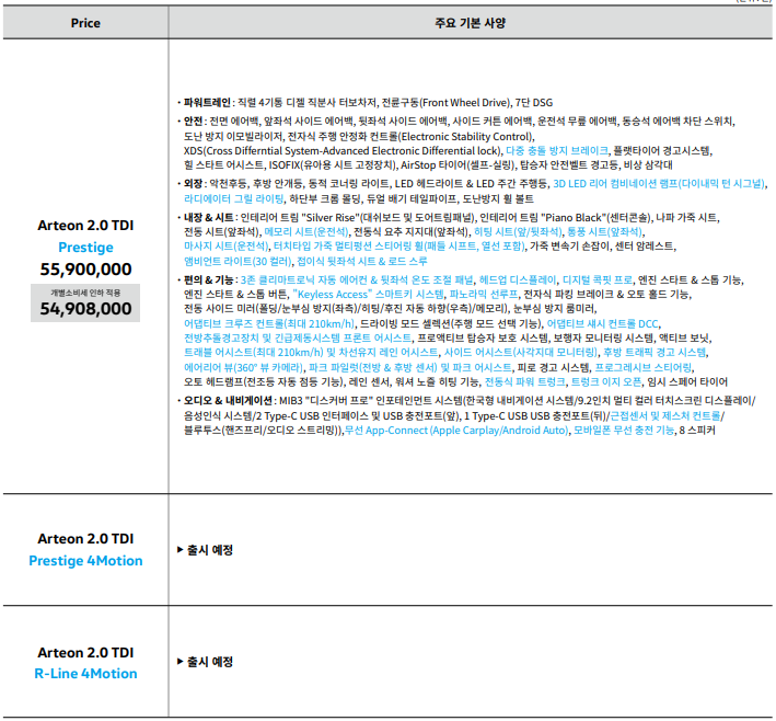 프레스티지 4Motion(4WD), R라인은 출시 예정입니다.
