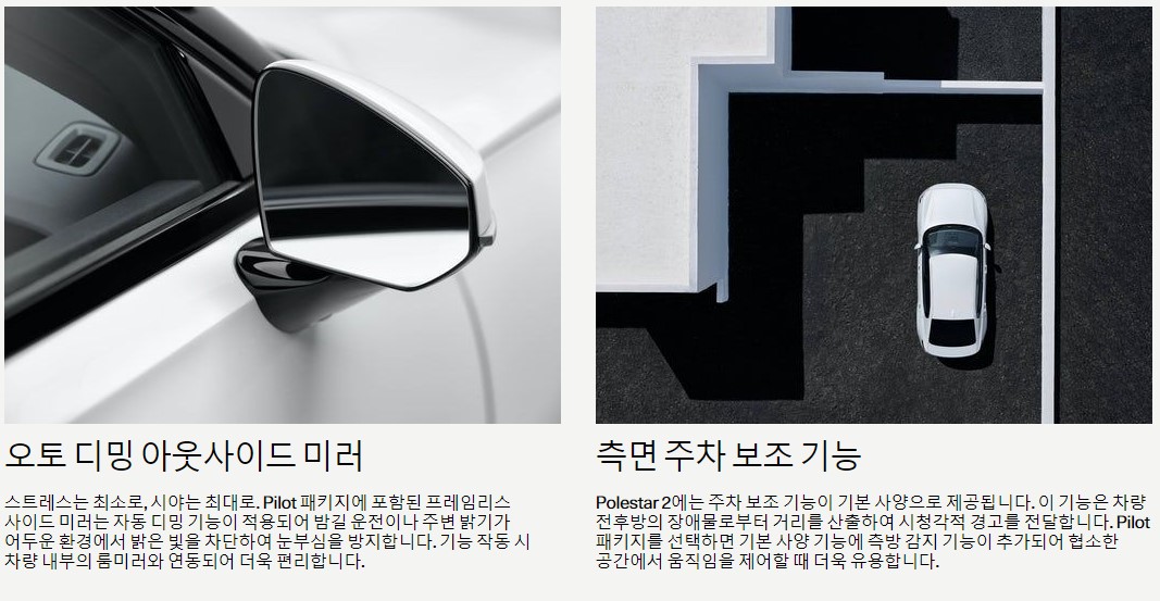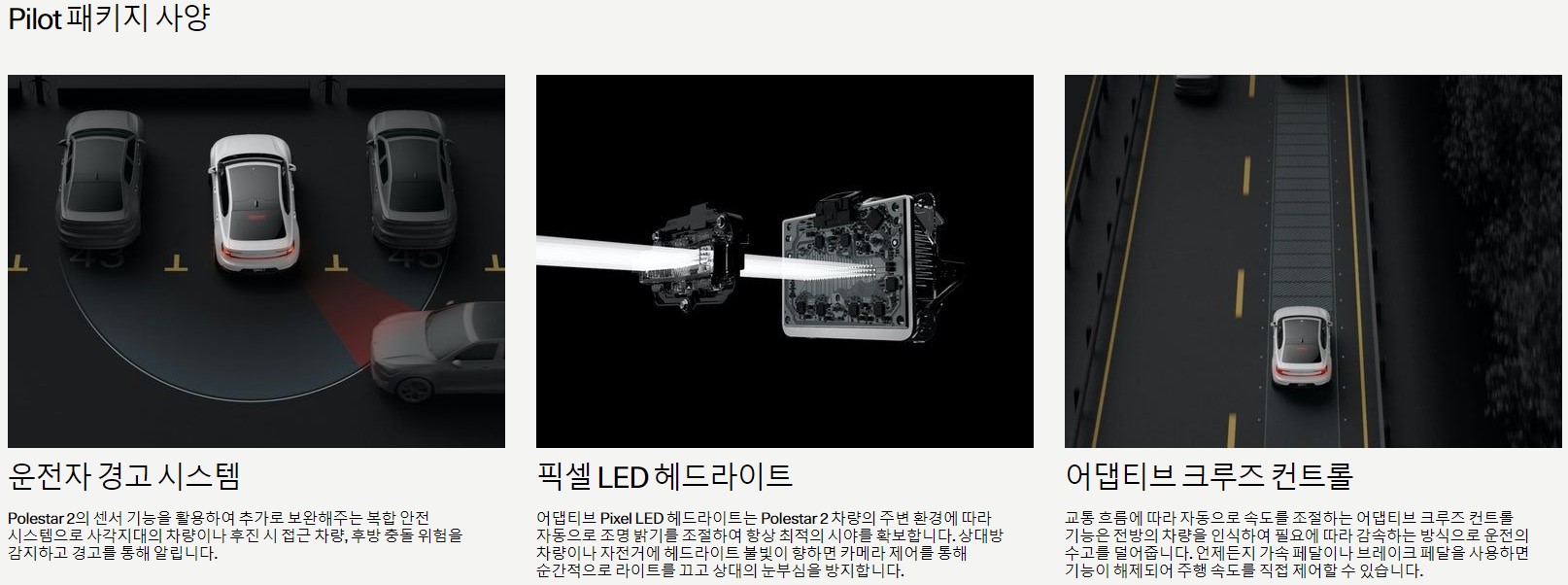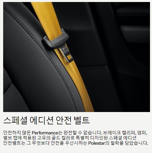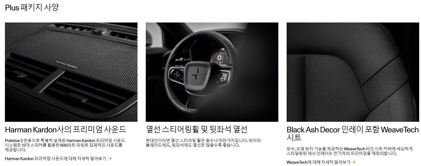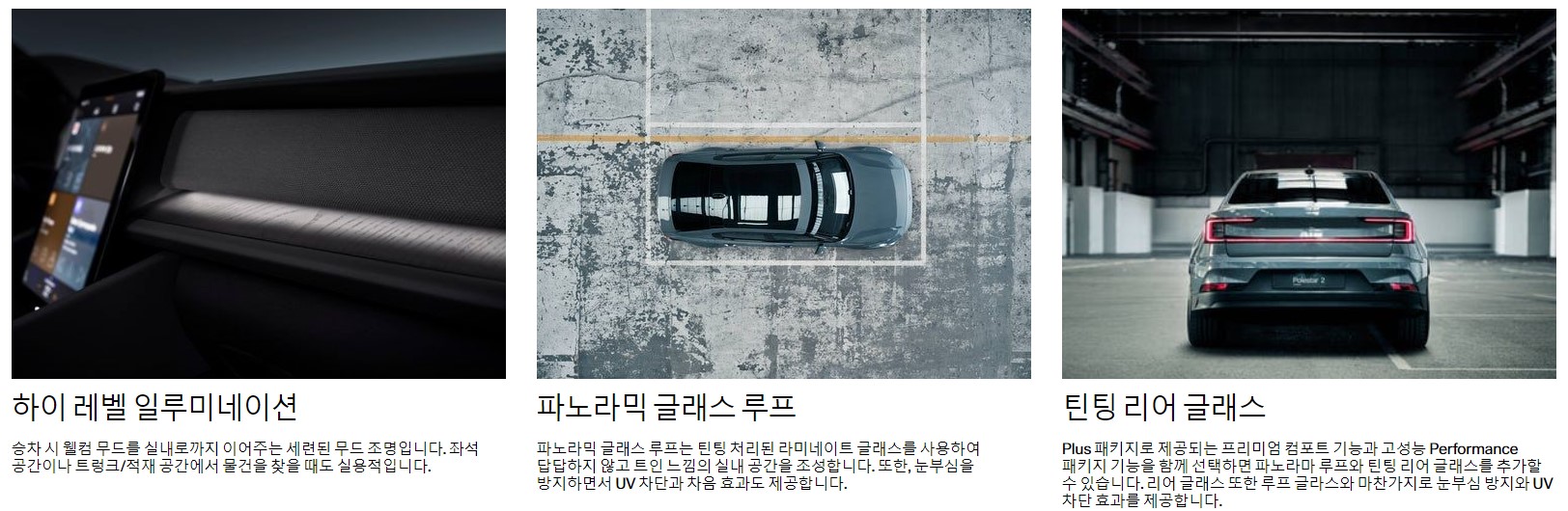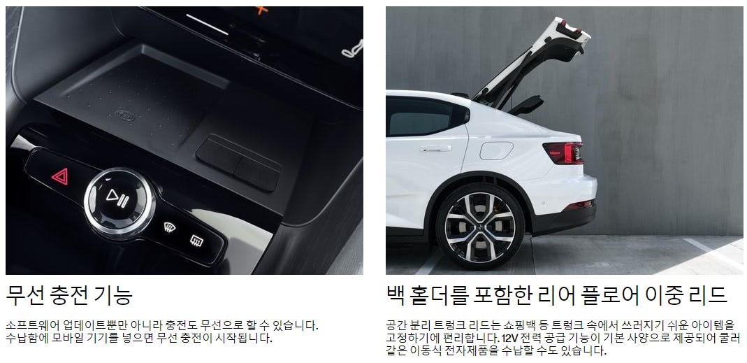 파노라믹 글래스 루프(Polestar로고 포함), Harman Kardon 사운드, Weave Tech 시트 및 Black Ash 장식, 전동 시트(4-way 전동 요추지지대), 수동 익스텐션 시트, 등받이 수납망 포함, 뒷좌석 열선시트, 열선 스티어링휠, 열선 워셔액 노즐, 하이 레벨 인테리어 일루미네이션, 스마트폰용 15W 무선 충전기, 쇼핑백 전용 홀더, 공간분리 트렁크 리드