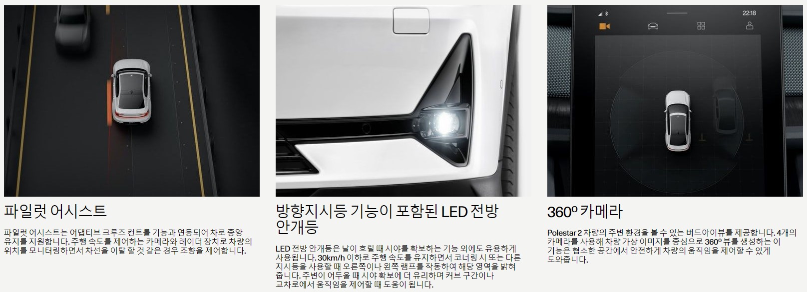 스탠다드 크루즈 컨트롤, 스틸 루프, 액티빔 하이빔 LED 헤드라이트, 어댑티브 LED 리어 라이트, 프레임리스 자동 눈부심 방지 실외 미러, 엠보싱 직물 시트 및 3D Etched Deco, 전동시트, 암좌석 열선 시트, 안드로이드 OS 시스템(Tmap, nugu, Flo), 폴스타 app, 디지털 키, ota 무선 업데이트, 안전지원 시스템, 표준 ADAS(충돌회비/완화 시스템, 도로이탈방지, 전방충돌방지, 차선유지, 충돌후제동, 운전준비 알림 시스템 등), 고성능오디오, 히트펌프, 애플카플레이(서비스예정), 전후방주차보조 시스템, 후방주차보조 카메라, 알람시스템(뒷좌석 전동 어린이 안전 잠금장치 포함), 일반키+액티비티 키, 핸즈프리 전동식 테일게이트, 12V 전원소켓(트렁크), 19" 스포크 블랙 다이아몬드 컷 알로이 휠, 전자동 프레임리스 사이드 미러, 레인센서, 미드 레벨 인테리어 일루미네이션, 2존 에어컨, USB-C 4개