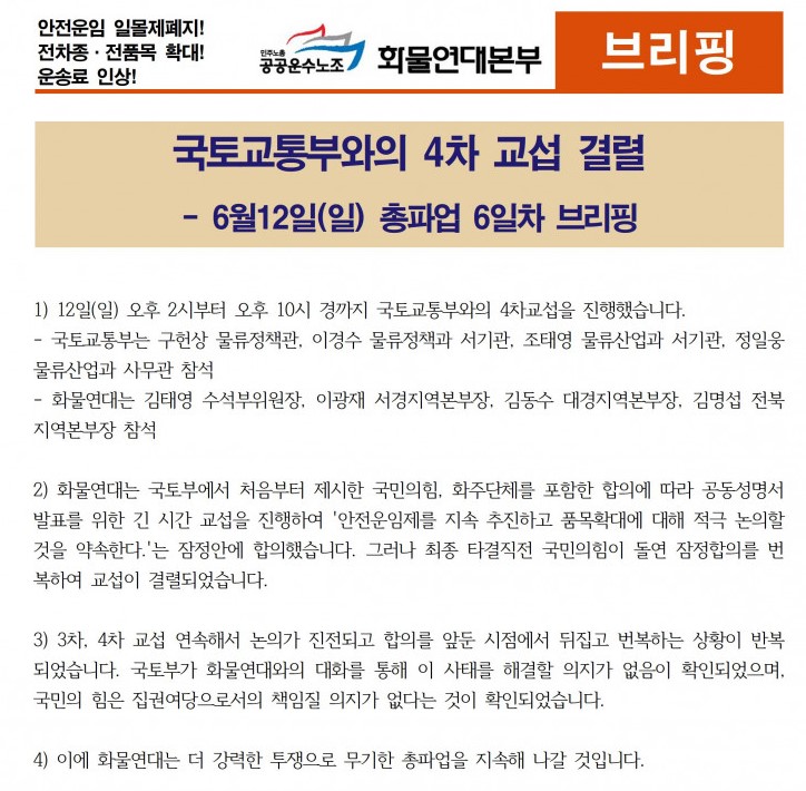 국토교통부에서 제시한 대로 국민의 힘, 화주단체를 포함해 안전운임제를 추진하고 품목 확대에 적극적으로 논의하겠다고 했지만, 최종 타결 직전 돌연 잠정 합의를 번복했다고 합니다.