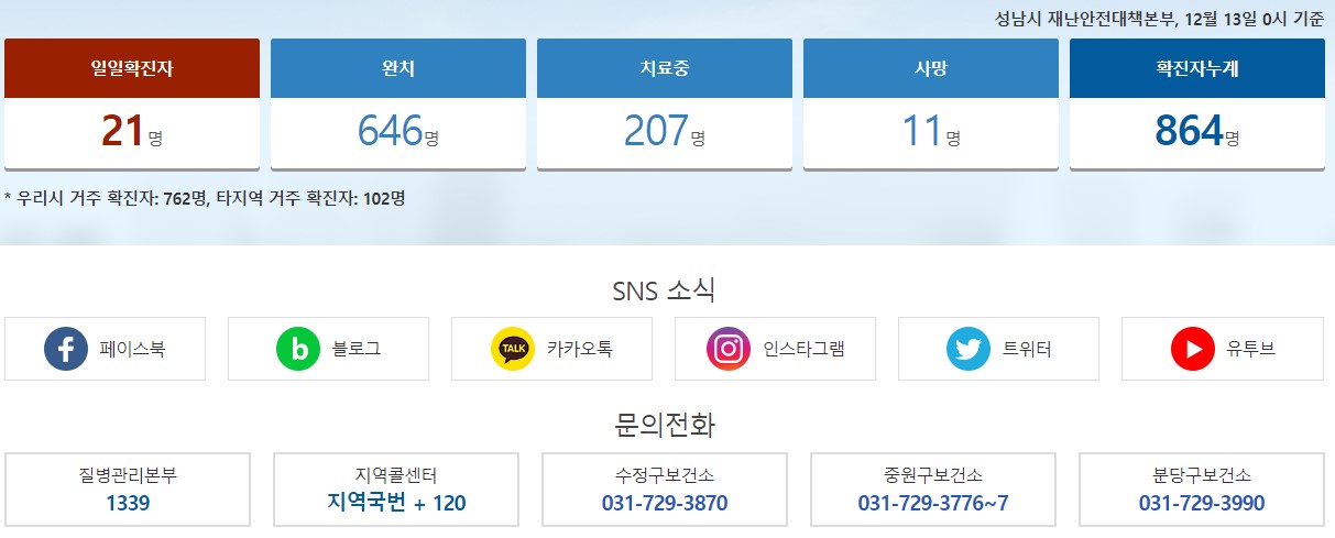 ▶ 12월 13일 0시 기준으로 우리시(성남시) 코로나19 확진자 현황을 알려드립니다.