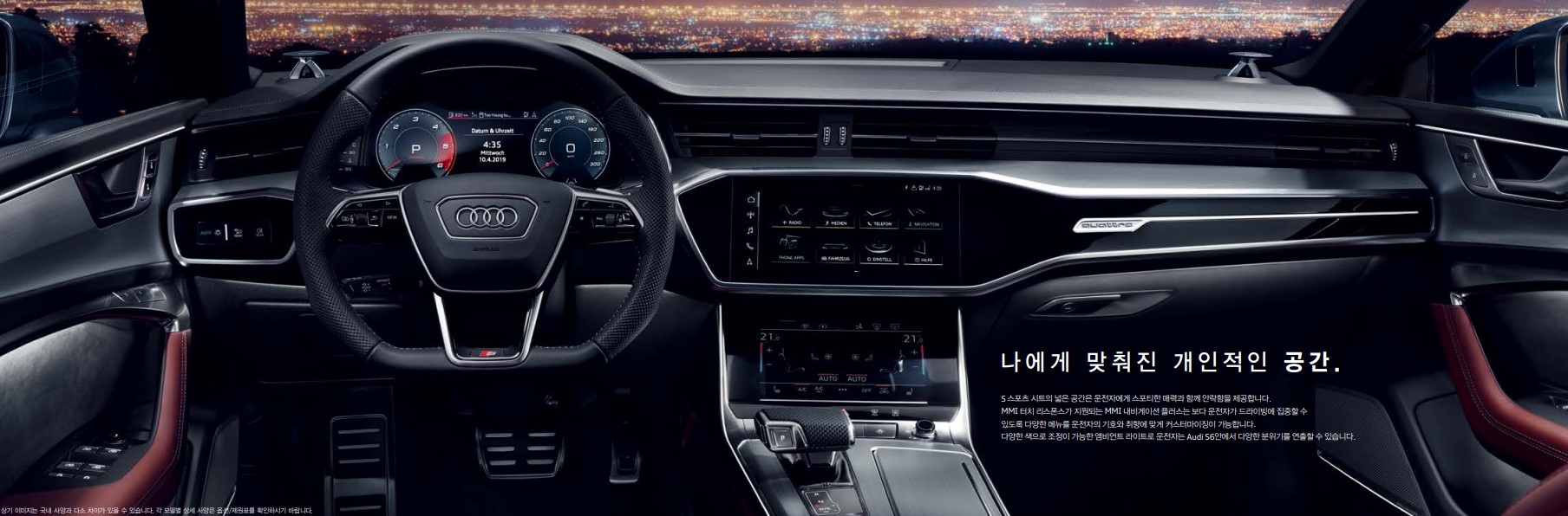 아우디는 'A숫자' (세단), 'Q숫자' (SUV)로 모델들을 표기 합니다. 그럼 S는 뭘까요? A와 Q모델들의 고성능 모델로 보시면 됩니다. S6는 A6의 고성능모델이겠죠? 외관적으로는 S로고 외에는 구분이 힘들지만, 내부적으로는 시트와 핸들과 기어봉에 들어가있는 S로고 들이 새겨져있습니다. 굳이 차별점이라면 매쉬타입의 전면 그릴과 전반적인 차량의 인상이 공격적이어서, 차를 모르는 사람들도 보면 '오 좀 달리게 생겼네' 라는 생각이 들정도입니다.