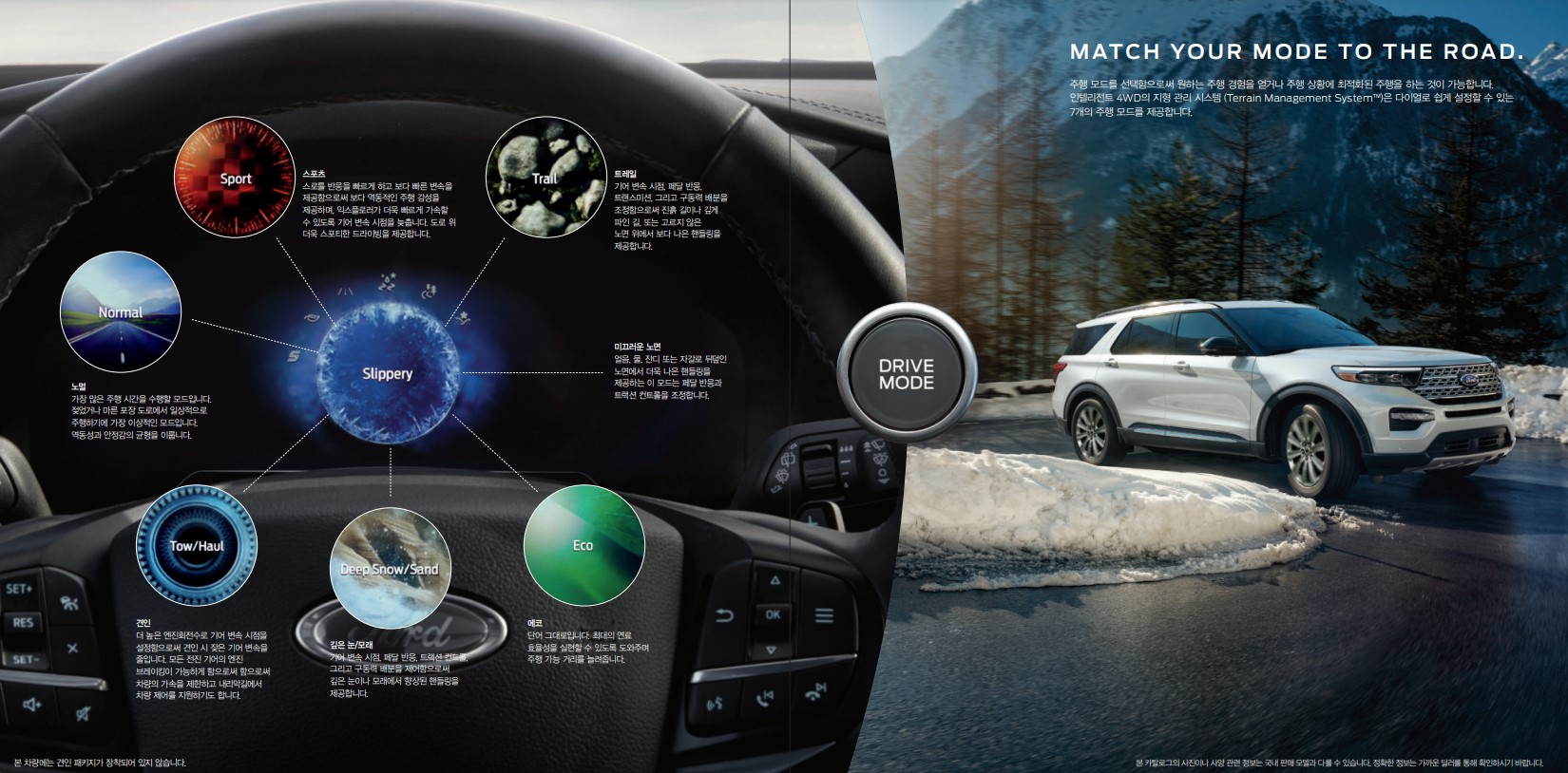 포드 익스플로러에는 온-오프로드 주행성능과 TMS(Terrain Management System) 지형관리 시스템이 들어가있는데, 7개의 주행모드를 제공합니다.