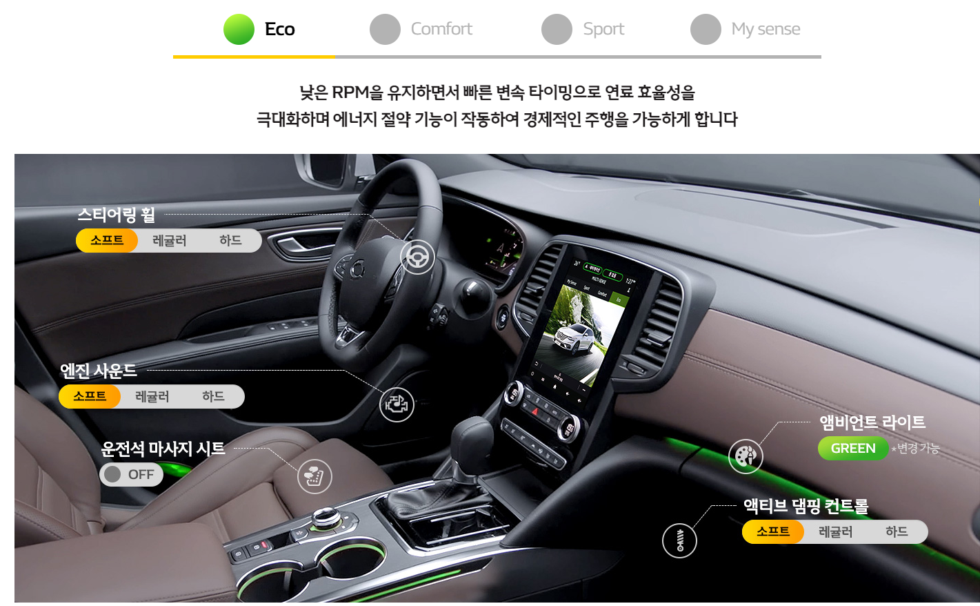 드라이빙 모드 통합제어 시스템에서는 4가지 모드를 선택가능합니다. Eco, Comfort, Sport, My Sense 인데, My Sense는 말 그대로 나만의 드라이빙 모드? 라고 하네요! 10.25인치 TFT 클러스터와 T맵이 적용된 9.3인치 이지 커넥트가 운전자의 주행상황을 알려줍니다.