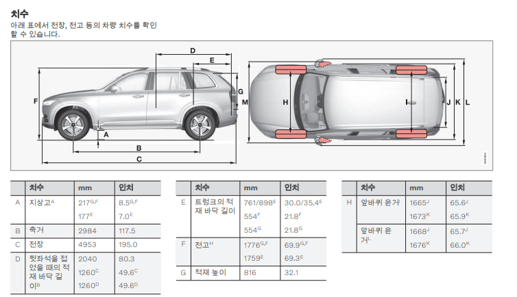 길이 : 전장(C)은 XC60에 비하여 4688mm 보다 약 270mm 정도 차이로 4953 mm 입니다.