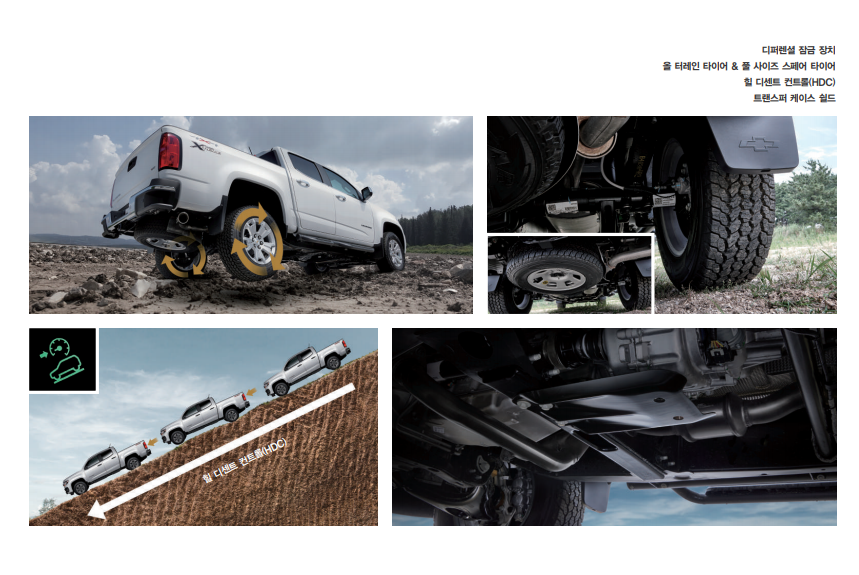 3.6리터 V6 직분사 가솔린 엔진을 기본으로 하는 콜로라도는 8단 자동변속기의 조합으로 최고출력 312마력, 최대토크38kg.m 을 발휘합니다. 다양한 노면도 거침없이 달릴수 있는 구동변환방식도 탑재하고, 밑에서 설명하겠지만 '힐 디센트 컨트롤'기능은 내리막길에서 자동으로 제동력을 발휘해 차량의 속도를 일정하게 유지하며 주행하는데 도움을 줍니다.
