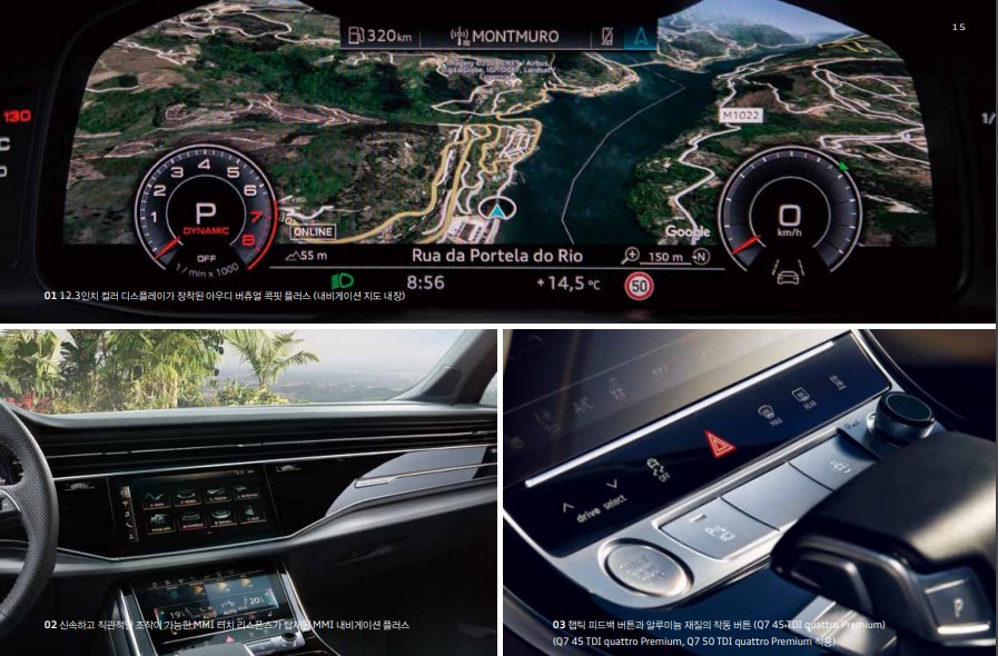 아우디 Q7은 역동적인 주행 경험을 제공하며, 노면, 부하, 속도 등 어떠한 상황에도 능숙하게 대처합니다. 시리즈에 기본 장착된 콰트로 4륜 구동 시스템이 스포티한 핸들링을 잡아줍니다. 기본으로 제공되는 7가지 아우디 드라이브 셀렉트 모드를 선택 할 수 있습니다.