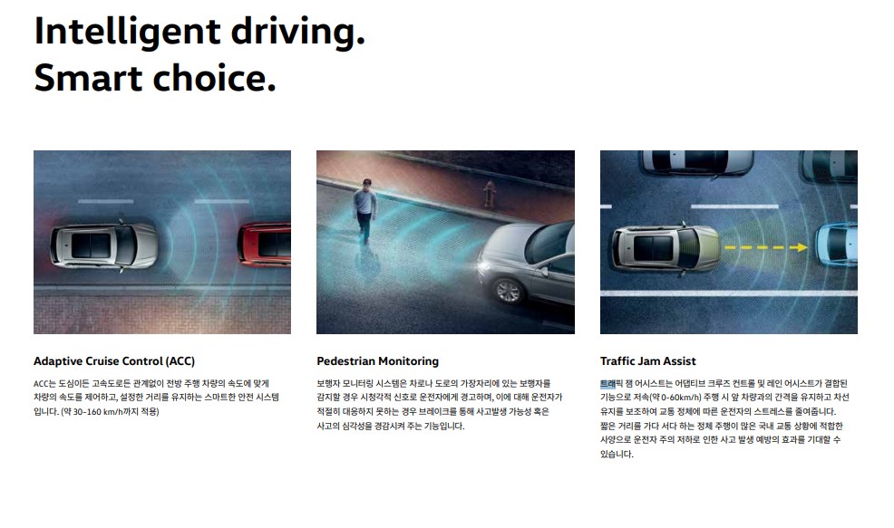 운전자 보조 시스템 중 '트래블 어시스트'도 모든 트림에 기본으로 장착됩니다. 트래블 어시스트는 저속(0-60km/h) 주행 시 앞차량과의 간격을 유지하고 차선 유지를 보조하여 교통정체에 운전자의 스트레스를 줄여줍니다. 우리나라처럼 출퇴근에 가다서다를 반복하는 구간에 운전자 부주의로 인한 사고 예방효과를 기대할 수 있습니다.