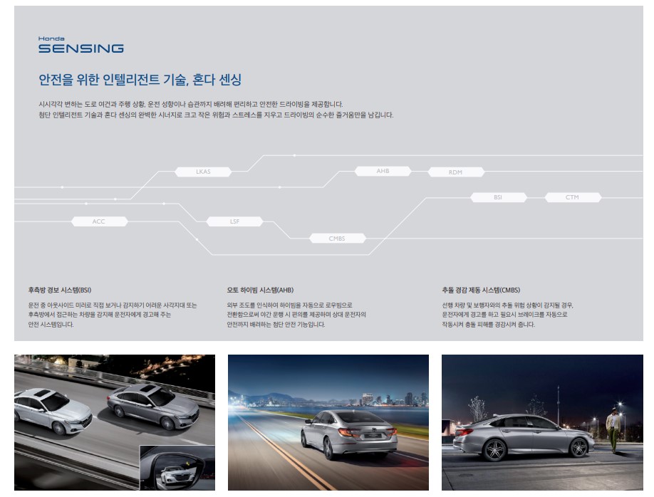 전 모델에서 더 보완된 '혼다 센싱'은 자율 주행의 꿈에 다가간 최첨단 주행 기술로 다양한 위험에 한발 앞서 대응하고, 차와 모든 도로 환경을 효과적으로 연결해 도로 위의 모든 사람이 안전할 수 있도록 지원합니다.