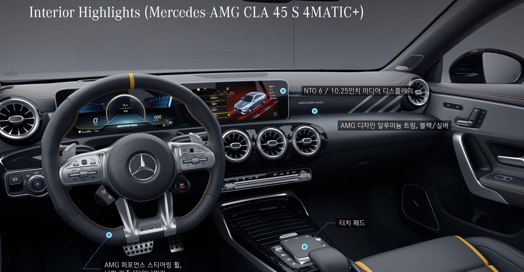 기본 모델인 CLA 250과의 주요 차이점은 4기통으로 421hp의 출력을 뿜어내는 AMG의 수제작 엔진과 뒷바퀴로 구동력을 100% 보낼 수 있어 드리프트모드를 지원하는 4MATIC+, AMG SPEEDSHIFT 8단 DCT 변속기, 자신의 서킷 주행 내용을 기록하는 AMG TRACK PACE라는 추가적인 인포기능이 있습니다.