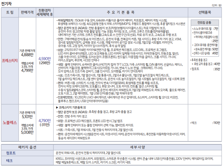 기존에 110만원의 옵션이던 히트펌프가 기본적용이 되었습니다. 대신에 노블레스 트림의 가격을 310만원 가량 낮추면서 노블레스 트림을 기존 프레스티지와 동일한 가격으로 살 수 있게 되었습니다.