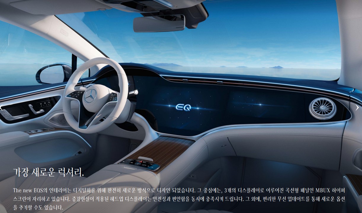 메르세데스 벤츠에서 국내에 판매하고 있는 3번째 벤츠 전기차 입니다. EQA와 EQC를 잇는 EQS 모델입니다.