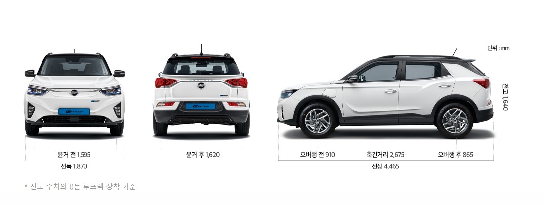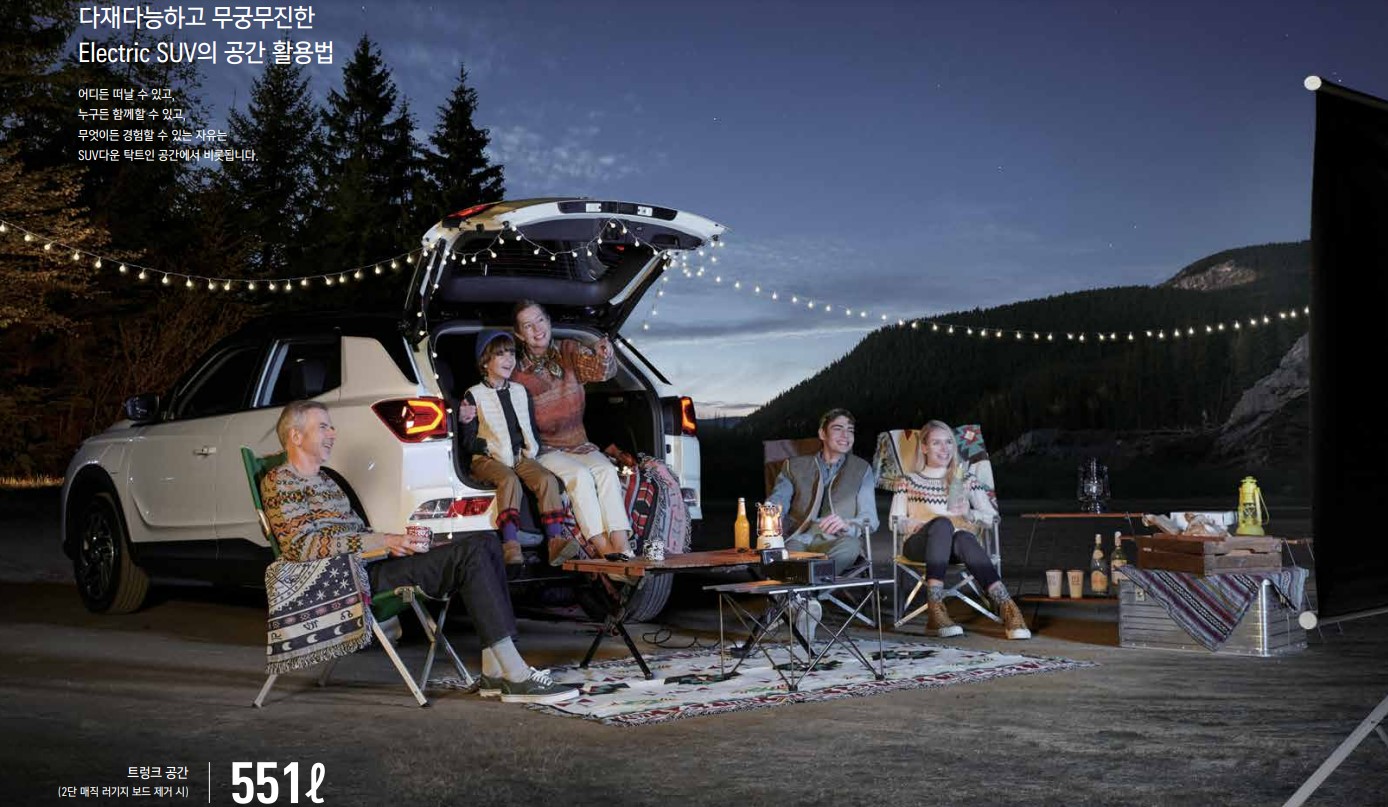 티볼리보다 조금 더 큰 사이즈인 준중형 SUV 크기 입니다. 그런데, 다른 준중형에 비해 가격은 아주 합리적입니다! 인기가 많을 수 밖에 없습니다. 광고에도, 사회초년생의 첫차도'라는 문구도 사용할 정도입니다. 아직 4WD 트림은 없고 2WD 모델로만 출시가 되고 있습니다. 디자인면에서는 코란도 4세대의 디자인과 거의 다를 바 없는 상태입니다. 단지 전기차모델들의 특징인 그릴이 막혀있다는 점을 빼면 정말 다를게 없다라는 평이 많습니다.
