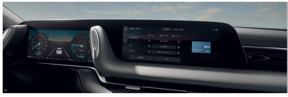 계기판은 클러스터와 내비게이션을 파노라막 디스플레이로 연결하여 자연스럽게 연동되는 화면전환으로 변했습니다.