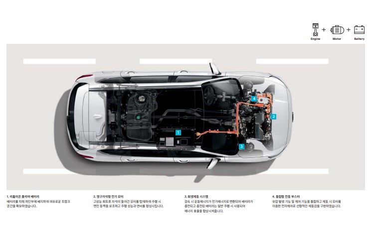 고성능 희토류 자석이 들어간 모터를 탑재하여 주행 시 엔진 동력을 보조하여 연비를 향상시킵니다.