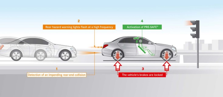 이 외에 따로 설명할만한 시스템으로는 PRE-SAFE가 있습니다. ▲PRE-SAFE 임펄스 사이드는 다른 차량으로부터 측면 충돌이 감지되면, 시트 내에 포함된 에어 챔버를 통해 충돌의 반대편으로 승객을 밀어냅니다. ▲PRE-SAFE 플러스 시스템은 후방 추돌 사고가 임박하게 될 경우 경고등을 빠르게 깜빡여 후미차량에게 경고를 보내주고, 안전벨트를 타이트하게 조이고 정지가 된 경우에는 더 단단히 제동력을 가하여 부상 위험을 줄입니다.