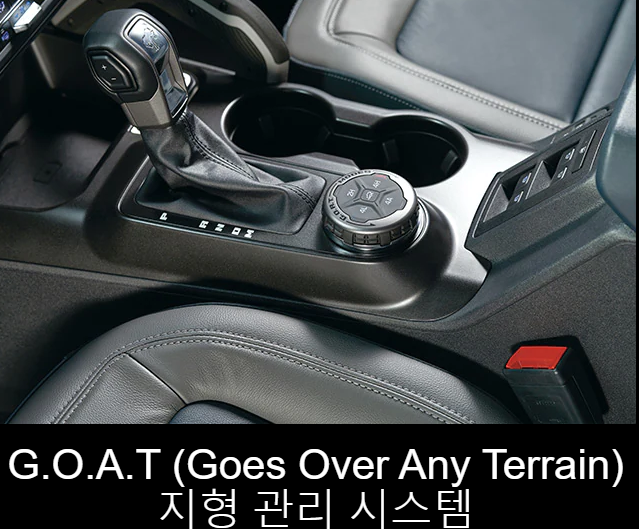 오프로드 차량답게 주행모드도 6가지로 지원됩니다. 포드에서 말하는 GOAT 시스템으로 Normal, Sport, Eco, Slippery, Sand, Mud/Ruts로 구성됩니다.